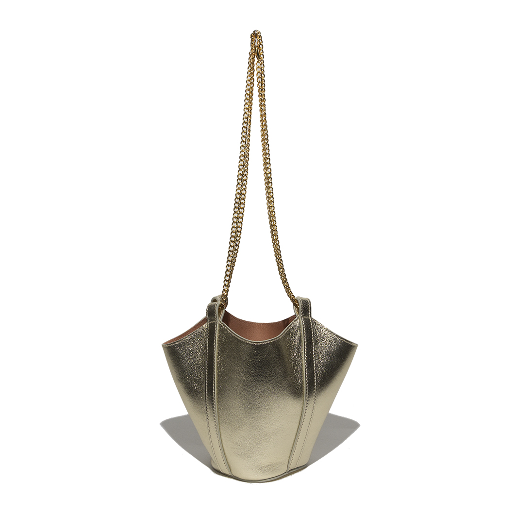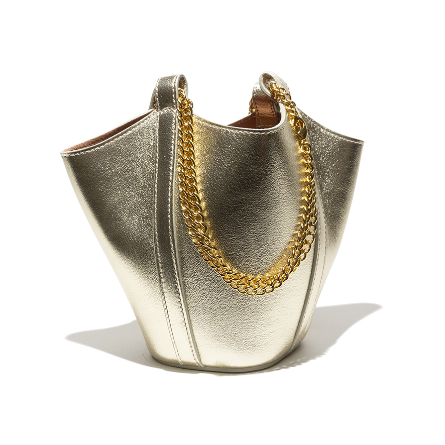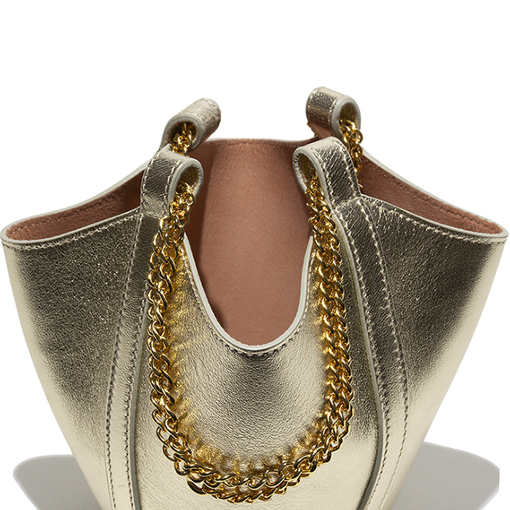La catena dorata chiude la borsa e diventa uno strap regolabile, da portare corto al polso o lungo a spalla.