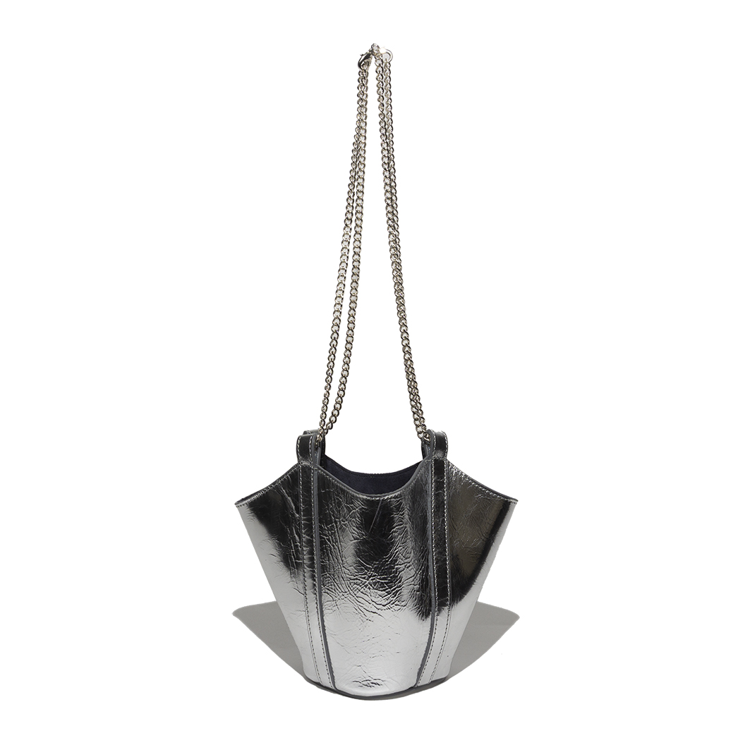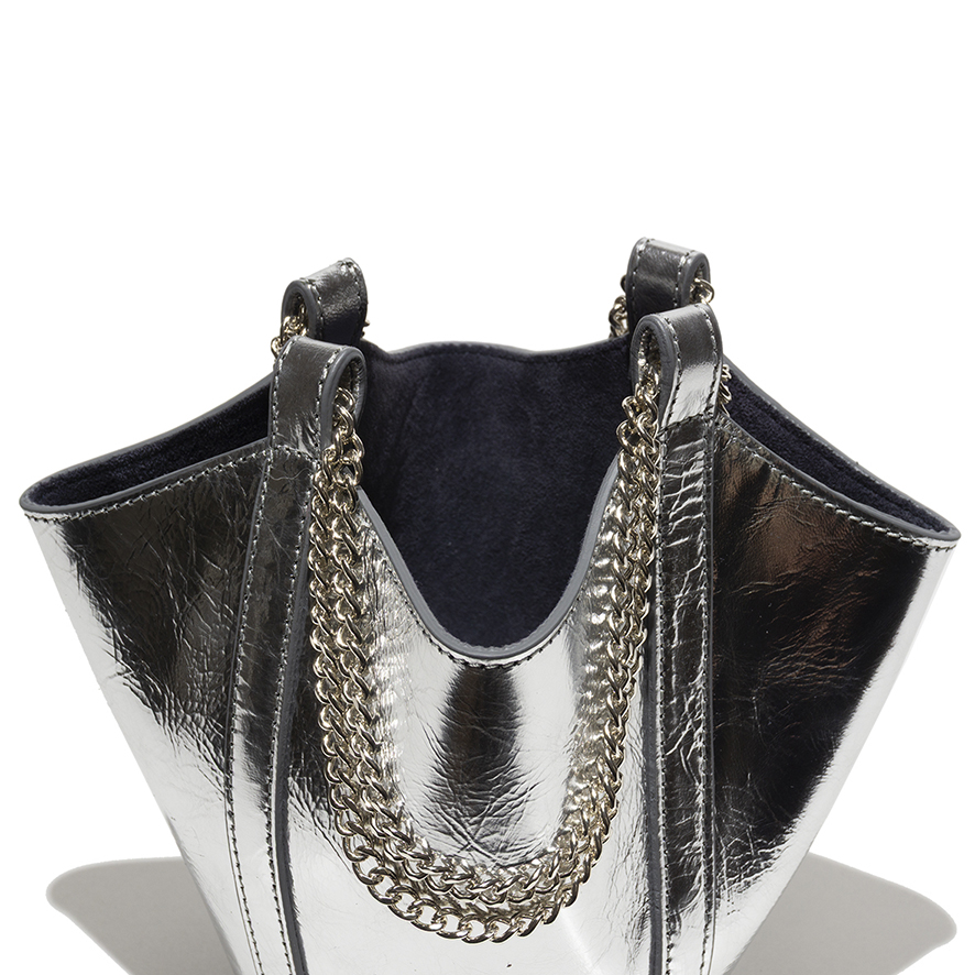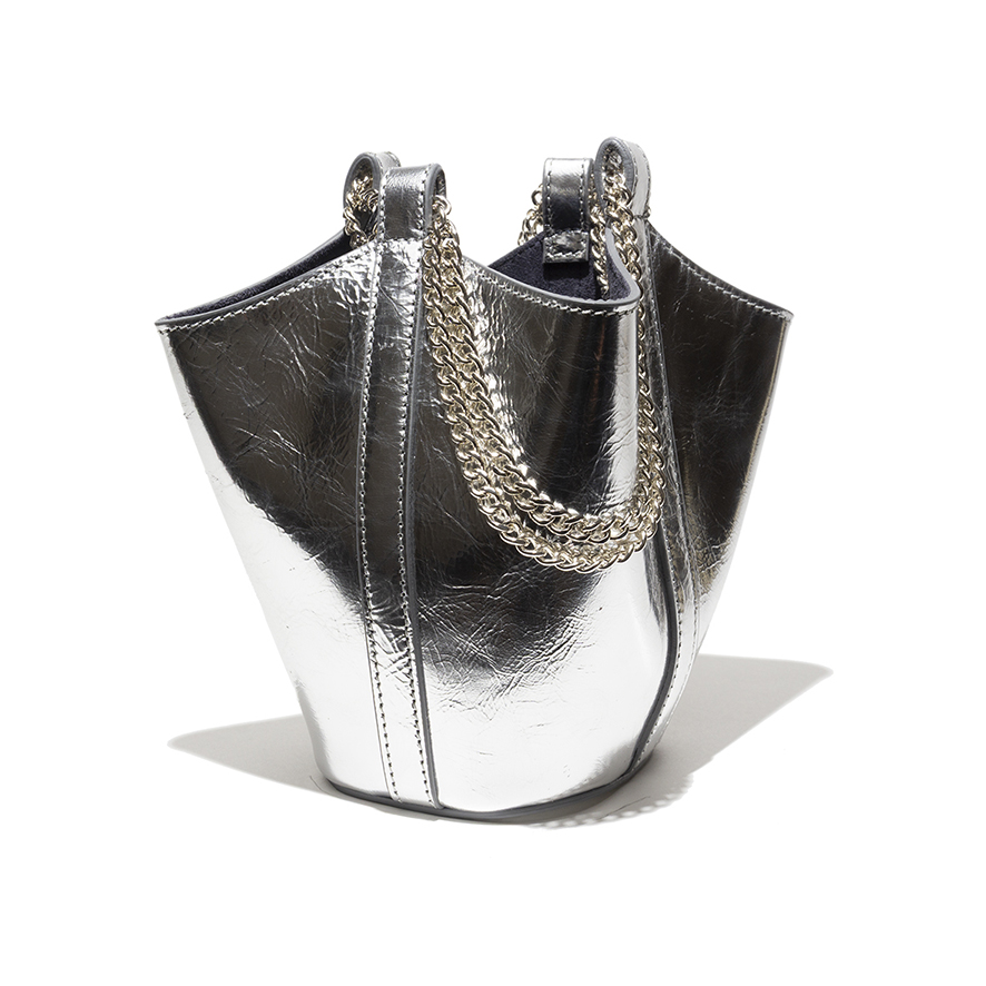 La catena dorata chiude la borsa e diventa uno strap regolabile, da portare corto al polso o lungo a spalla.